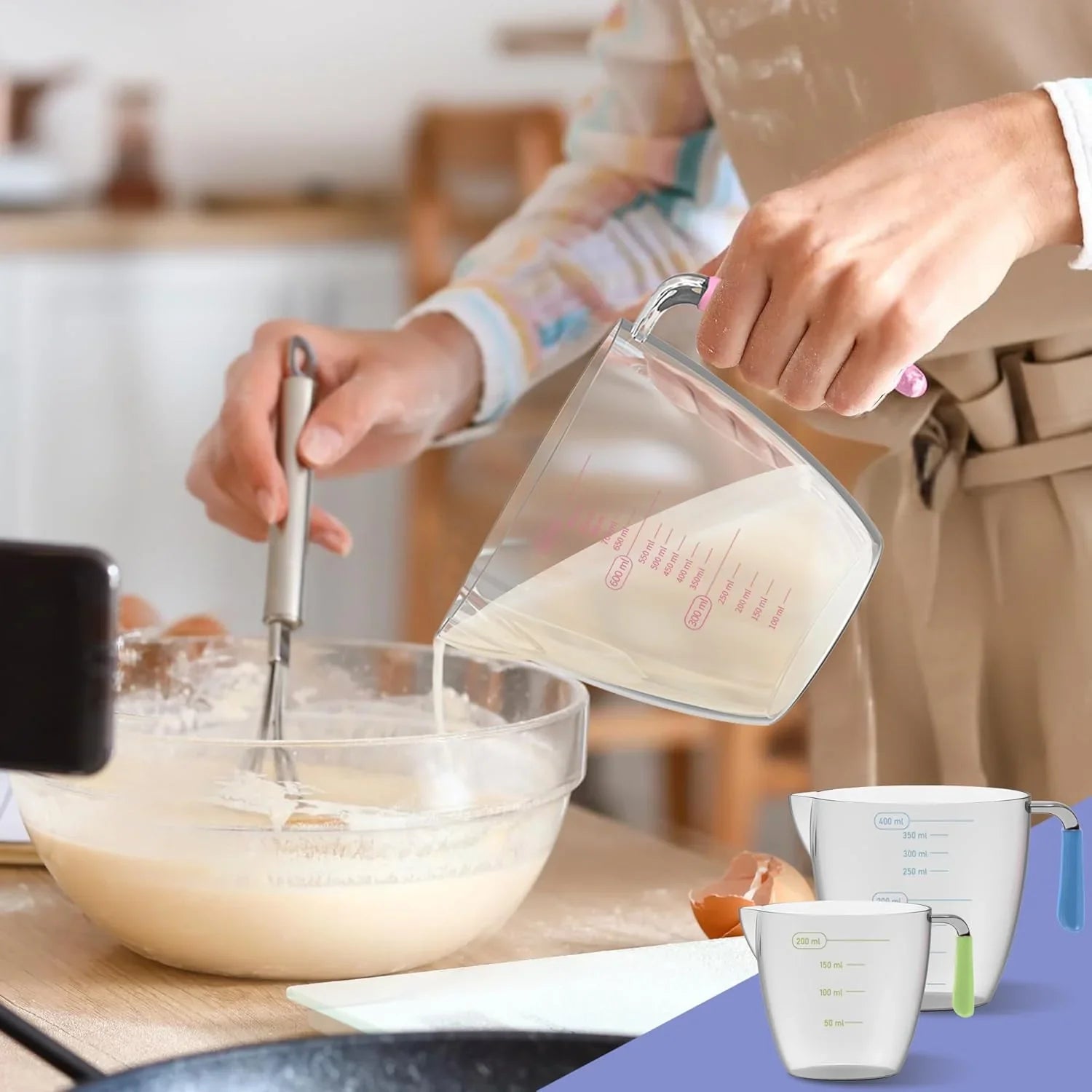 The three clear plastic liquid measuring cups are perfect for measuring water, stock, milk, oil, and other wet ingredients. Clear, easy-to-read markings ensure accuracy during meal prep, baking, batch cooking, and recipe testing.