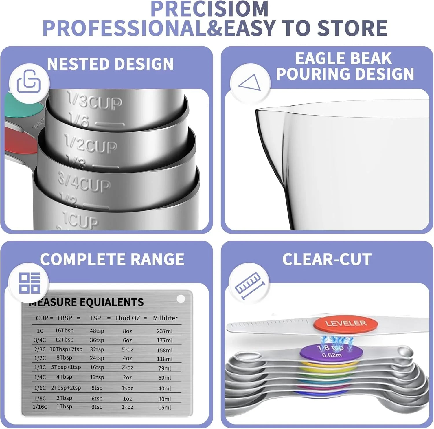 The stainless steel measuring cups and spoons are rust-resistant, sturdy, and built to last. The thick, solid metal feels premium and strong in hand. This design is ideal for busy kitchens that need durable, long-lasting measuring tools.