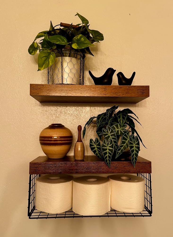 Over Toilet Floating Shelves (Set of 3) — maximize small bathroom space with rustic brown farmhouse-style wall shelves designed for everyday storage. Display decor, store towels, and keep toilet paper within reach with a built-in metal basket.