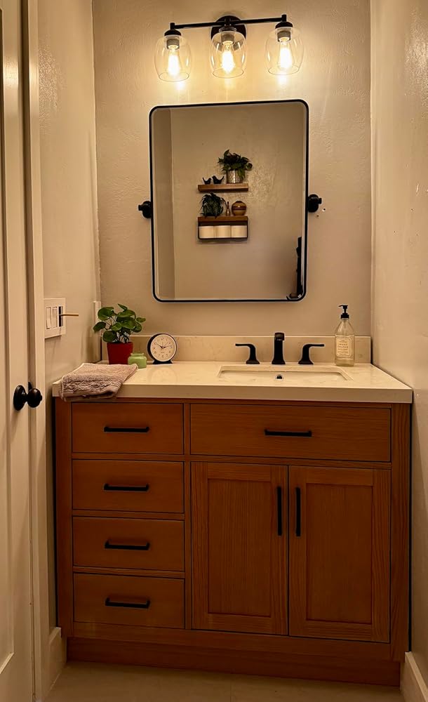 - Depth fits baskets, folded towels, books, and bathroom essentials.